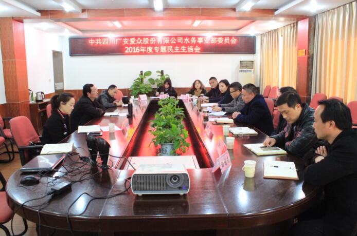 2017年2月28日,水務事業(yè)部黨委在三樓會議室召開了以“兩學一做”學習教育為主題的2016年度領導班子專題民主生活會。水務事業(yè)部領導班子成員,黨委、紀委全體委員參加會議;行政管理部有關(guān)人員列席會議。...